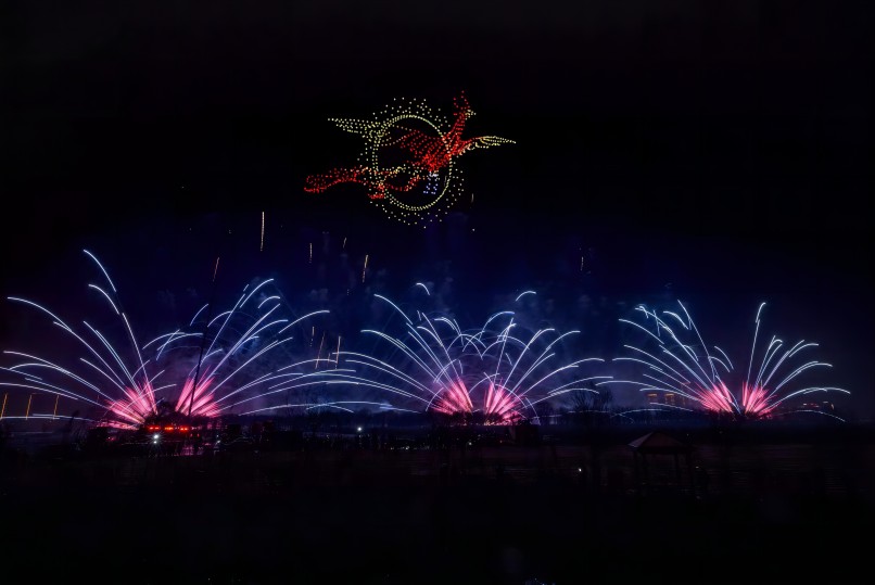 在煙花秀表演期間,由1000架無人機組成無人機群在空中組成了多個畫面,“鳩茲和鳴”鳩鳥飛舞栩栩如生,還有“龍呈祥瑞”金龍昂首喚春歸。