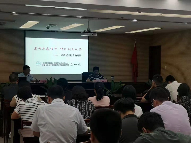 作為安徽首批援鄂醫(yī)療隊總負(fù)責(zé)人,姜小敢主任曾帶領(lǐng)團隊分別在武漢太康醫(yī)院、協(xié)和東西湖醫(yī)院、肺科醫(yī)院開展了“疫情阻擊戰(zhàn)”、“疫情圍剿戰(zhàn)”和“疫情殲滅戰(zhàn)”。姜主任從抗疫經(jīng)歷回顧、感悟抗疫精神、體會制度優(yōu)勢等三方面回顧和分享了他馳援武漢抗擊疫情的經(jīng)歷和體會。一幅幅身臨一線的圖片、一段段飽含深情的話語,生動再現(xiàn)了疫情發(fā)生后,全國各地醫(yī)護人員、防疫人員、共產(chǎn)黨員及社會各界不怕危險、不怕犧牲,筑起防御病毒的堅強堡壘的感人事跡。那一段段用生命守望生命的故事讓現(xiàn)場的每位聆聽者心靈都受到強烈震撼和感動。
